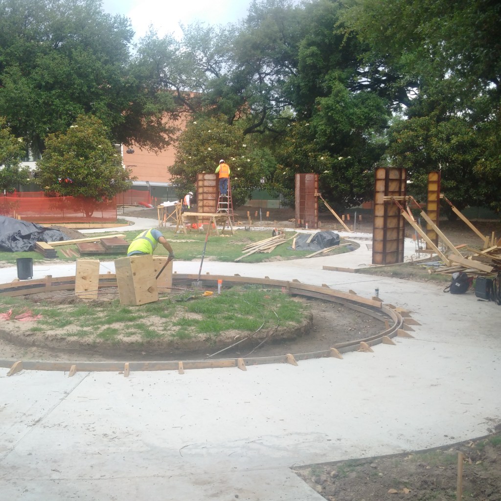 LBJ statue circle in foreground, with the connecting walkway and 5 pylon holders, which will display LBJ’s most significant events. The space circle will be installed in the background.